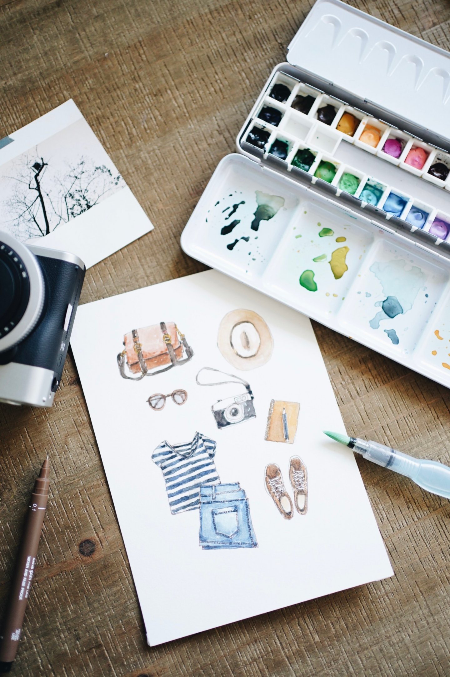 *畫下要陪伴旅行小物件: 相機/保溫杯/側背包/行李箱/太陽眼鏡/草帽/衣物….