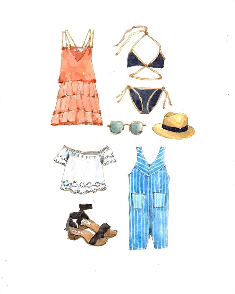 *畫下要陪伴旅行小物件: 相機/保溫杯/側背包/行李箱/太陽眼鏡/草帽/衣物….