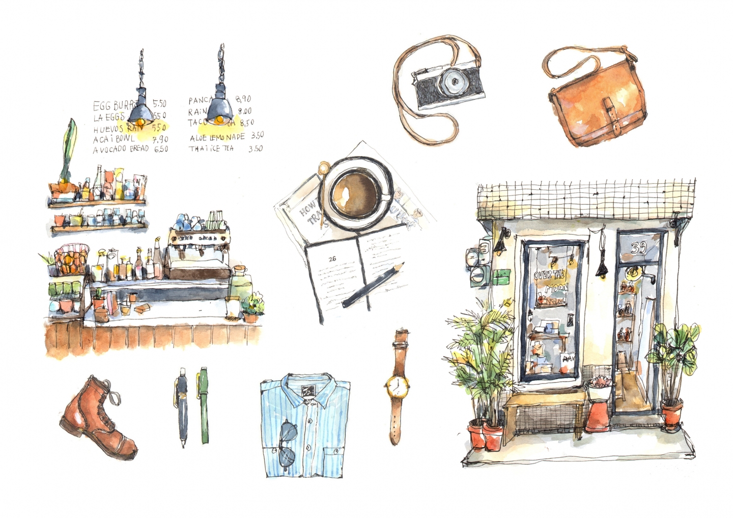 從陪伴旅行的小物件、巷弄裡的甜點美食、風格小店到美麗的街景,用畫筆記錄旅行的美好!