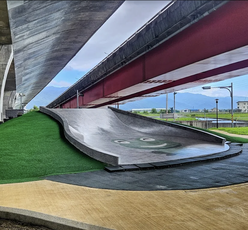 是免費的小孩放電好去處,有大大的溜滑梯、蹺蹺板、攀爬區、沙池等等,位在陸橋下可以遮