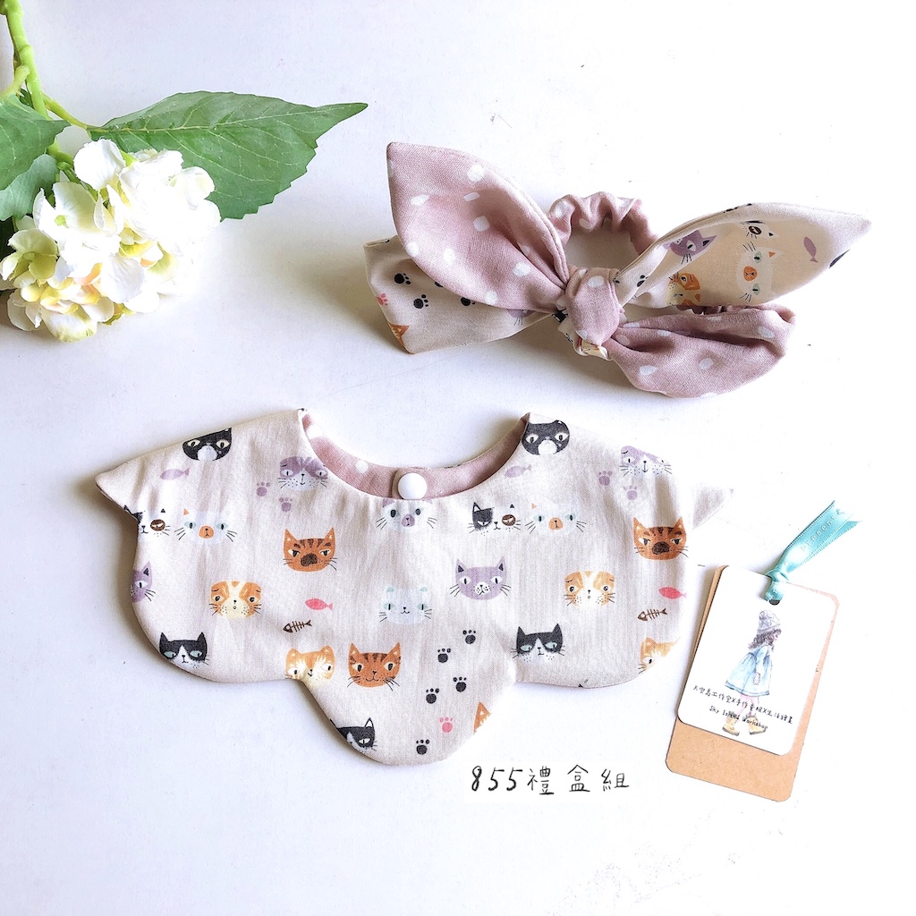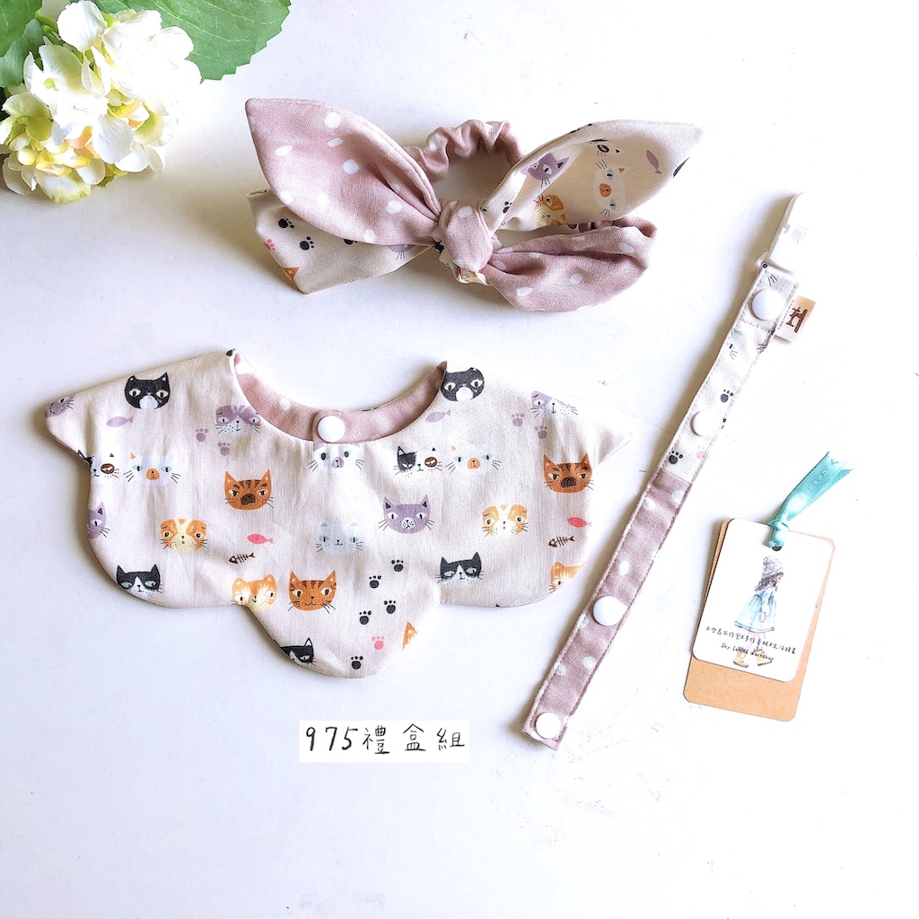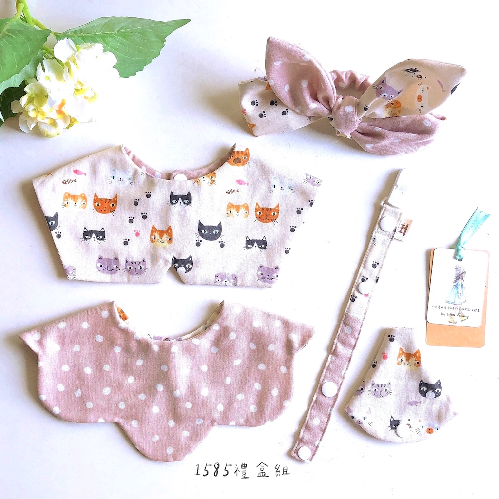 女寶寶-貓咪點點雙面圍兜/髮帶/奶嘴鏈 彌月禮盒