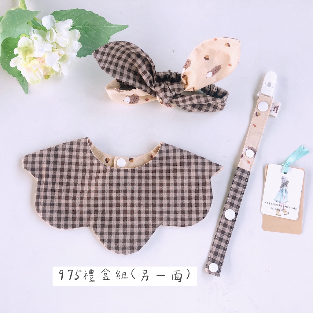 女寶寶-小刺蝟雙面圍兜/髮帶/奶嘴鏈 彌月禮盒